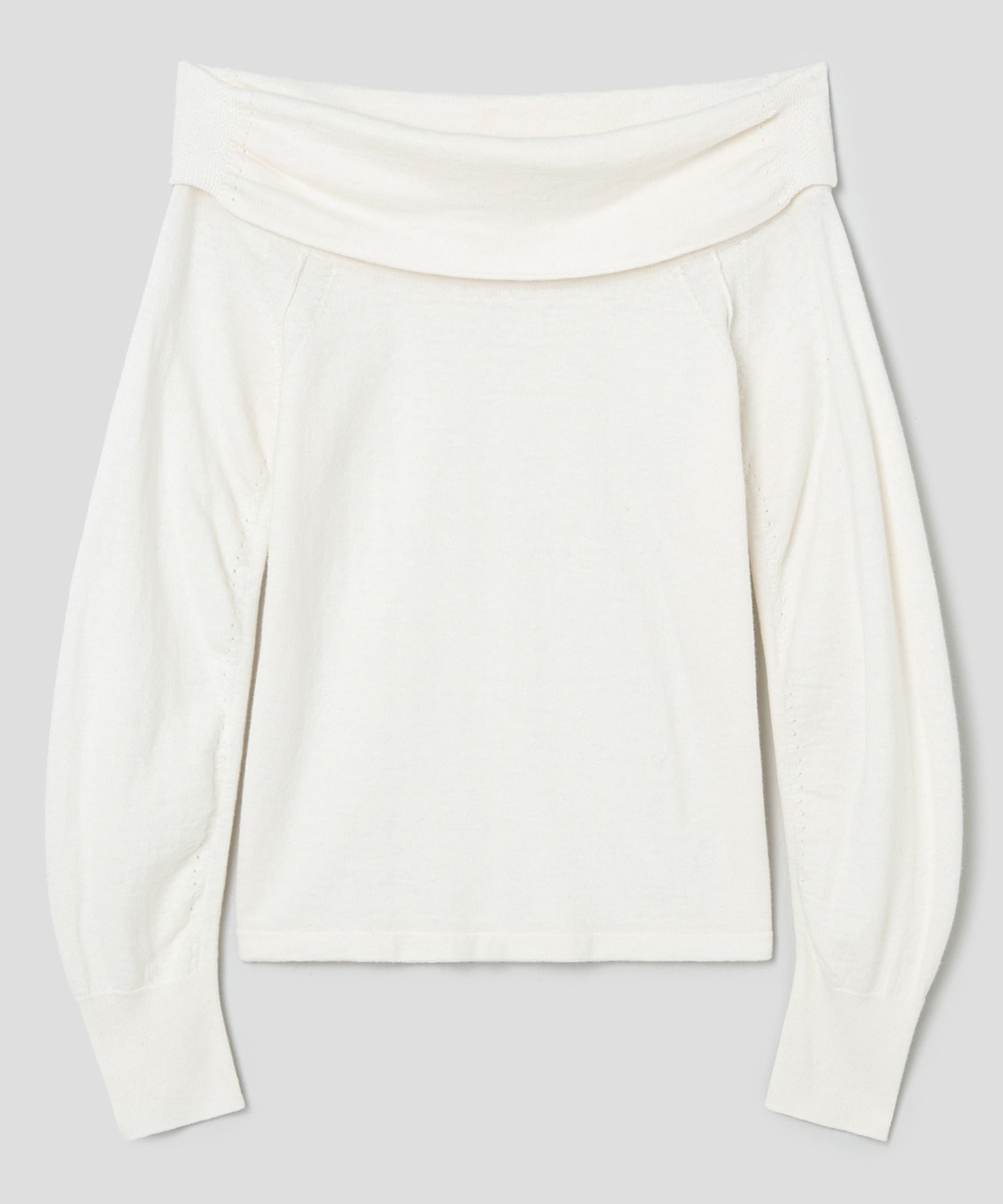 トレンドの折り返しデザインを取り入れたオフショルダーで、ヘルシーに肌見せできるニットトップス。ラグランスリーブを採用しており、腕の動きが妨げられず、肩や腕が動かしやすくなっています。カシミヤ素材を使用しており、ウールのようなチクチク感がなく、ヌメリ感のある柔らかく優しい肌触りです。袖口はリブ仕様となっており、伸縮性があるため簡単に着脱でき、冷気の侵入を防いで体温を保ちます。裏返しているユニークな仕上がりで縫い目をあえて見せたデザインになっています。